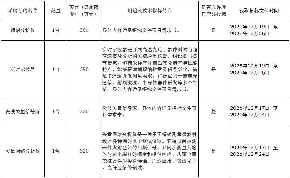 2025 年12月17日至12月19日,南開大學(xué)智能光子研究院在中國政府采購網(wǎng)連續(xù)發(fā)布四項(xiàng)招標(biāo)公告,預(yù)算金額1945萬元,涉及四款最高端的電子測(cè)試儀器:預(yù)算620萬元矢量網(wǎng)絡(luò)分析儀1臺(tái)、預(yù)算250萬元微波矢量信號(hào)源1臺(tái)、預(yù)算385萬元頻譜分析儀1臺(tái)、預(yù)算690萬元實(shí)時(shí)示波器1臺(tái)。