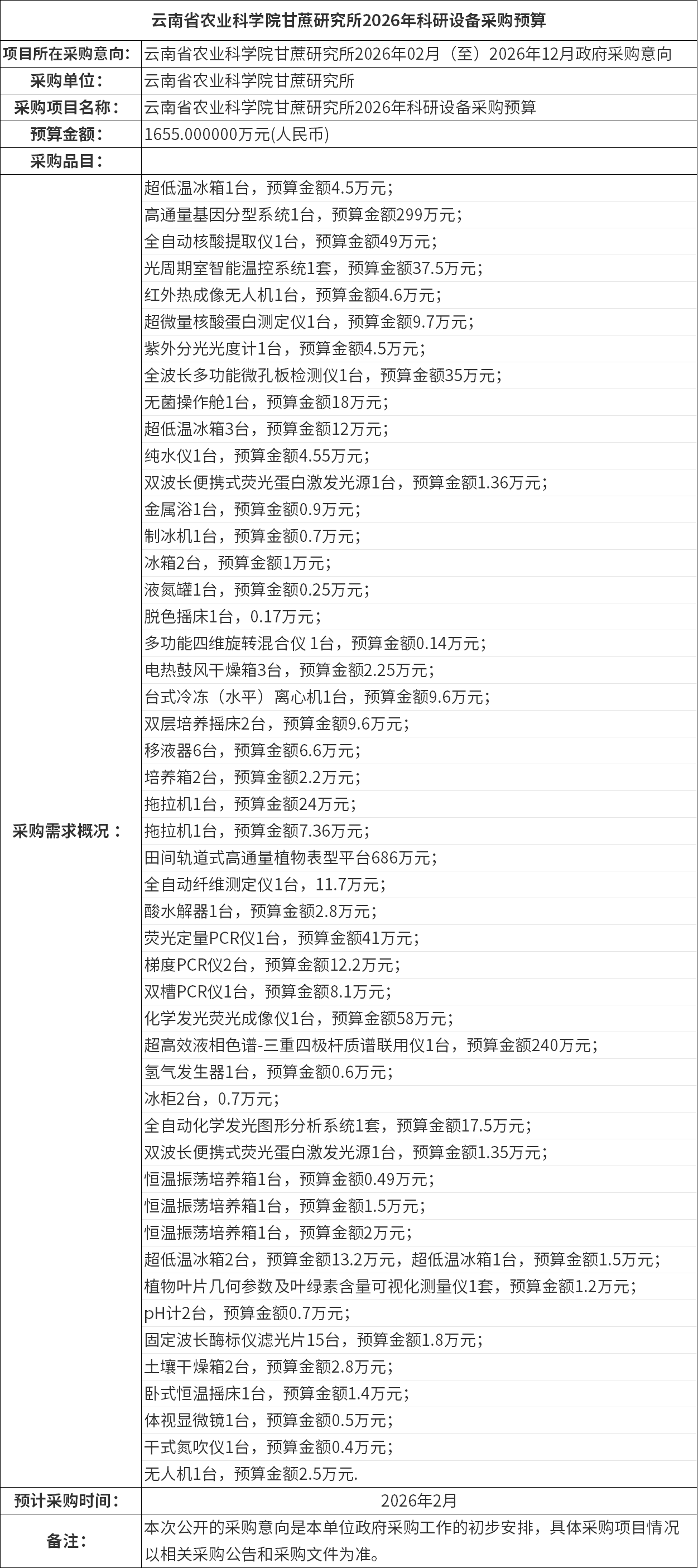 云南省農(nóng)業(yè)科學(xué)院甘蔗研究所2026年年科研設(shè)備采購(gòu)預(yù)算情況發(fā)布,采購(gòu)51臺(tái)套儀器設(shè)備,預(yù)算金額1655萬(wàn)元。