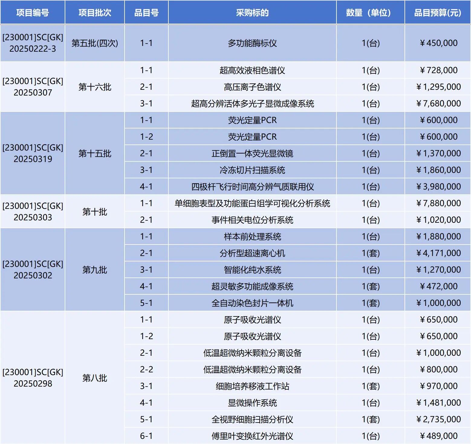 據(jù)統(tǒng)計(jì),本次計(jì)劃采購(gòu)的儀器設(shè)備總預(yù)計(jì)招標(biāo)金額超過(guò)8200萬(wàn)元,涵蓋四極桿飛行時(shí)間高分辨氣質(zhì)聯(lián)用儀、高效液相色譜儀、研究級(jí)倒置熒光顯微鏡、倒置多功能熒光成像系統(tǒng)、熒光定量PCR儀、高壓離子色譜儀、多功能酶標(biāo)儀、傅里葉變換紅外光譜儀、原子吸收光譜儀、超靈敏化學(xué)發(fā)光成像儀、超高頻高分辨率小動(dòng)物超聲成像系統(tǒng)、小動(dòng)物活體三維成像系統(tǒng)、超靈敏多功能成像系統(tǒng)、單細(xì)胞表型及功能蛋白組學(xué)可視化分析系統(tǒng)等共計(jì)40項(xiàng)高端科研設(shè)備。