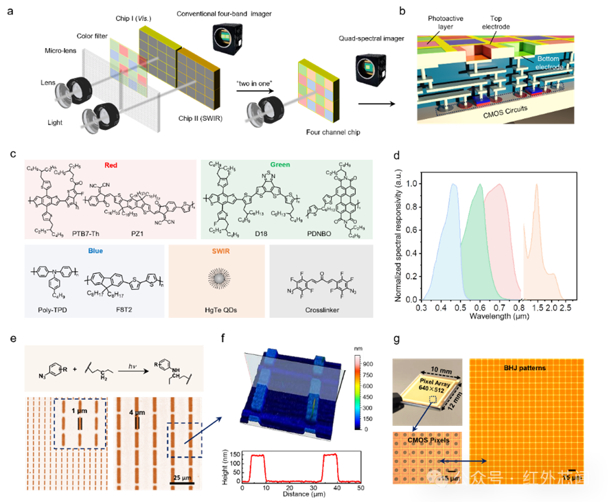 1聚焦多通道圖像傳感器的核心設(shè)計(jì)與制備基礎(chǔ),系統(tǒng)呈現(xiàn)集成架構(gòu)、材料選型、圖案化機(jī)理及CMOS兼容特性。對(duì)比采用可見(jiàn)光圖像傳感器+短波紅外圖像傳感器的分離架構(gòu),這項(xiàng)研究聚焦單一集成芯片設(shè)計(jì),將可見(jiàn)光像素與短波紅外像素集成于單芯片,解決了復(fù)雜分光光路設(shè)計(jì)難題,且通過(guò)直接光刻圖案化工藝,實(shí)現(xiàn)多波段探測(cè)像素單片集成,解決了可見(jiàn)光與短波紅外像素CMOS工藝的兼容性難題。利用圖案化技術(shù),本體異質(zhì)結(jié)(BHJ)及膠體量子點(diǎn)像素可以與讀出電路(ROIC)單片集成,具有640×512像素陣列,像素間距為15 μm