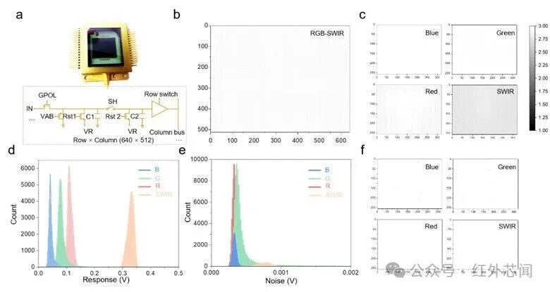 所提出的直接光圖案化方法與標(biāo)準(zhǔn)CMOS制造工藝完全兼容。研究人員將基于聚合物的三色可見(jiàn)光像素與基于碲化汞量子點(diǎn)的短波紅外像素單片集成到同一讀出電路上。這種混合集成策略使得四通道成像器件得以實(shí)現(xiàn),其中可見(jiàn)光和短波紅外像素以2×2陣列排列,每個(gè)子陣列的有效分辨率為320×256