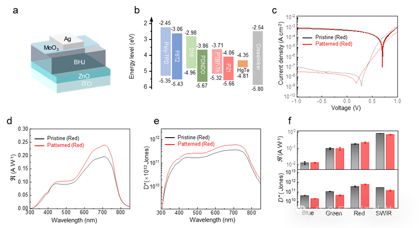 能圖2主要展示圖案化后單元像素器件性能表征。非破壞性圖案化方法對(duì)于保持高性能光電探測(cè)器的光電完整性至關(guān)重要。為了評(píng)估光電二極管架構(gòu)中像素圖案化的兼容性,采用有機(jī)異質(zhì)結(jié)和碲化汞量子點(diǎn)作為活性層,制備了單元器件,并對(duì)圖案化前后的電流曲線(xiàn)、響應(yīng)光譜、比探測(cè)率、響應(yīng)度等關(guān)鍵指標(biāo)進(jìn)行了系統(tǒng)表征。