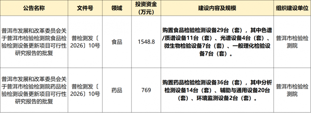 近日,普洱市發(fā)展和改革委員會正式批復(fù)普洱市檢驗(yàn)檢測院食品、藥品兩大領(lǐng)域檢驗(yàn)檢測設(shè)備更新項(xiàng)目可行性研究報告,兩個項(xiàng)目總投資達(dá)2317.8萬元,將通過超長期特別國債與單位自籌相結(jié)合的方式,全面提升區(qū)域食品藥品檢驗(yàn)檢測技術(shù)水平,筑牢民生安全底線。