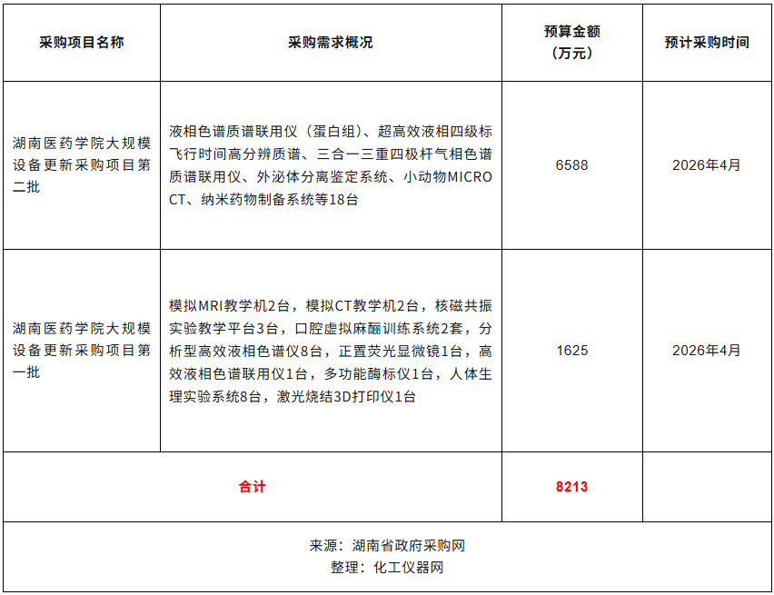 近日,湖南醫(yī)藥學(xué)院公布2026年2季度采購意向,計(jì)劃采購液相色譜質(zhì)譜聯(lián)用儀、外泌體分離鑒定系統(tǒng)、核磁共振實(shí)驗(yàn)教學(xué)平臺、分析型高效液相色譜儀、正置熒光顯微鏡、多功能酶標(biāo)儀等47臺儀器設(shè)備,預(yù)算總金額8213萬元。預(yù)計(jì)采購時(shí)間2026年4月。