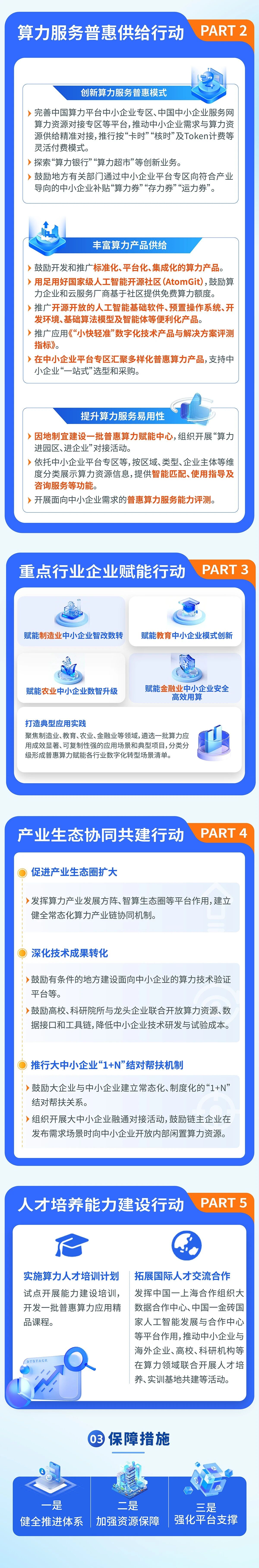 5.豐富算力產(chǎn)品供給。鼓勵(lì)開發(fā)和推廣標(biāo)準(zhǔn)化、平臺(tái)化、集成化的算力產(chǎn)品,提供更加靈活的資源配置,降低開發(fā)代碼難度,提升運(yùn)維可視化及生態(tài)社區(qū)完備化。用足用好國(guó)家級(jí)人工智能開源社區(qū)(AtomGit),鼓勵(lì)算力服務(wù)企業(yè)和云服務(wù)廠商基于社區(qū)提供免費(fèi)算力額度。推廣開源開放的人工智能基礎(chǔ)軟件、預(yù)置操作系統(tǒng)、開發(fā)環(huán)境、基礎(chǔ)算法模型及智能體等便利化產(chǎn)品。推廣應(yīng)用《“小快輕準(zhǔn)”數(shù)字化技術(shù)產(chǎn)品與解決方案評(píng)測(cè)指標(biāo)》,引導(dǎo)開發(fā)適配中小企業(yè)需求的算力產(chǎn)品與工具。促進(jìn)云電腦、云手機(jī)、云渲染、云直播等服務(wù)應(yīng)用。在中小企業(yè)平臺(tái)專區(qū)匯聚多樣化普惠算力產(chǎn)品,支持中小企業(yè)“一站式”選型和采購(gòu)。